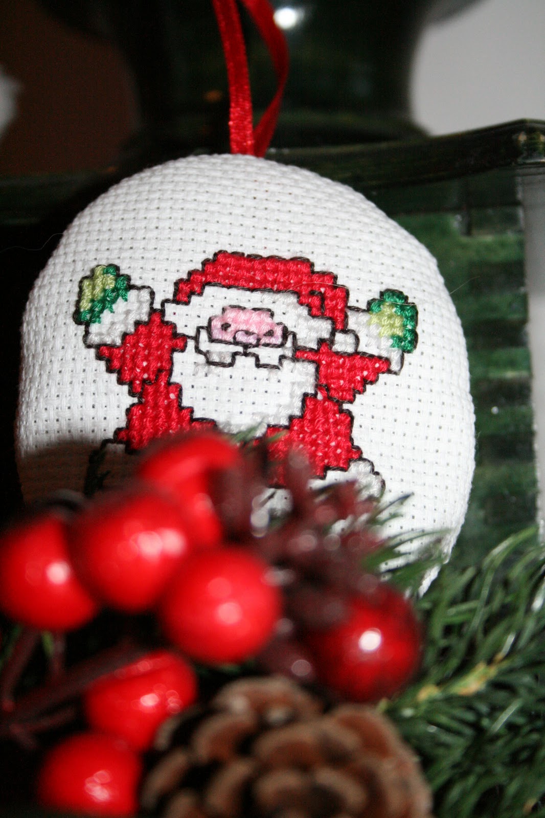 Zrobiłam też zawieszkę z hafcikiem mikołajka co by zawisł w świątecznym okresie w dziecięcym pokoju i czerwoną czapeczkę także do zawieszenia....z góry założyłam, że ten Mikołaj to będzie pikuś, a tu masz babo placek, okazało się, że takie maleństwo zrobić równo, wypchać a potem cieszyć się z estetyki jego wykonania to nie tak łatwo jakby się wydawało. Pierwsze koty za płoty- wyszło jak widać, nastepnym razem będzie lepiej. A tu chylę czoła przed Ateną, kóra jest dla mnie guru w tej dziedzinie. Anetko podziwiam Twój kunszt i doskonałość.